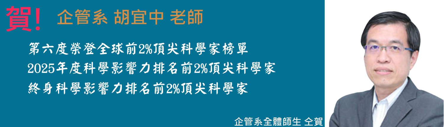 賀!~本系胡宜中特聘教授,榮登「全球前2%頂尖科學家」榮耀
