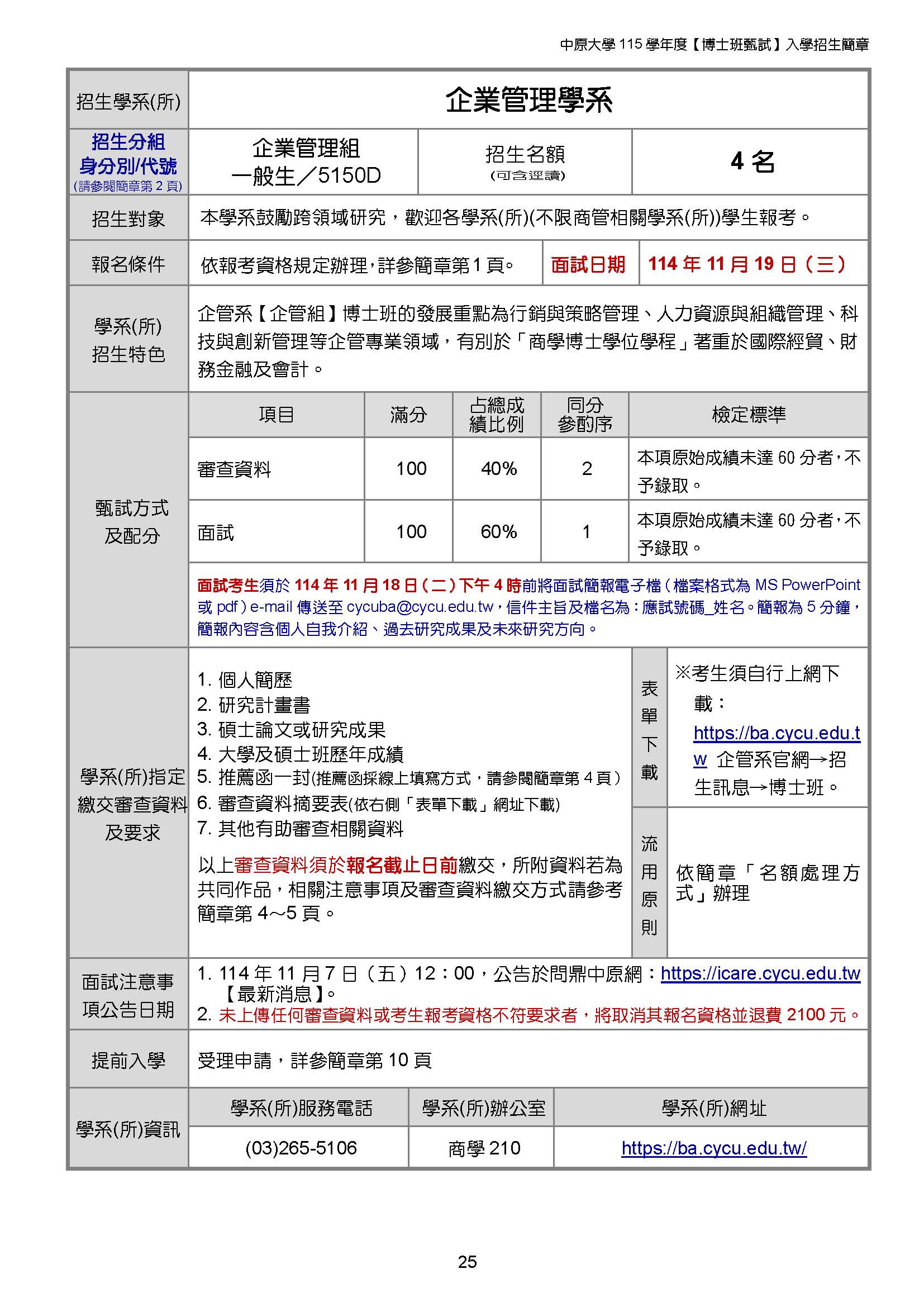 【115學年度】企管系博士班甄試入學(企管組) 2025年3月11日/在: 博士班 /通過: 賴志瑋報名期間:114年10月14日(二)09:00至114年11月03日(一)12:00止 網路報名 繳費期間:114年10月14日(二)09:00至114年11月03日(一)15:30止 資料上傳期間:114年10月14日(二)09:00至114年11月03日(一)17:00前 資料上傳 參考資料如附件 甄試招生簡章、審查資料摘要表[WORD][ODT]、審查資料檢核表[WORD][ODT] 本年度為線上推薦函,請於報名系統填寫推薦人資料後點選「寄發通知信」 https://ba.cycu.edu.tw/wp-content/uploads/2020/03/CYBA-logo-png-300x135.png 0 0 賴志瑋 https://ba.cycu.edu.tw/wp-content/uploads/2020/03/CYBA-logo-png-300x135.png 賴志瑋2025-03-11 10:06:302025-09-24 16:04:57【115學年度】企管系博士班甄試入學(企管組)