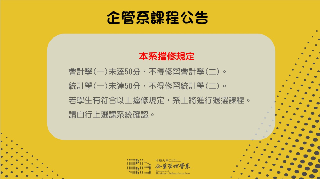 欲退選114-2企管系”必修課”的同學,請於選課期間至CYCU表單登記,登記前請務必詳閱退選須知,登記完成表示同意其相關規定。